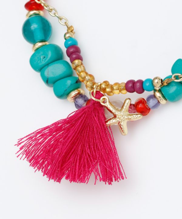 トロピカルリゾートを連想させるようなテンションが上がるカラフルなビーズを贅沢に使った、2連ボリュームアンクレット。星のチャームとフリンジがポイントです。