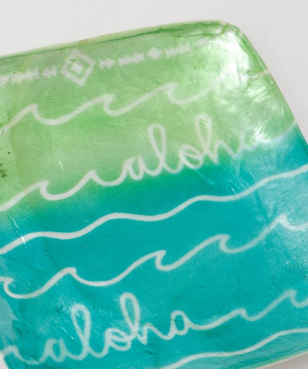 フィリピンの海でとれたカピス貝を加工し、プリントを施したミニトレイ。光沢がありキラキラとした素材が魅力的です。アクセサリー置きに。