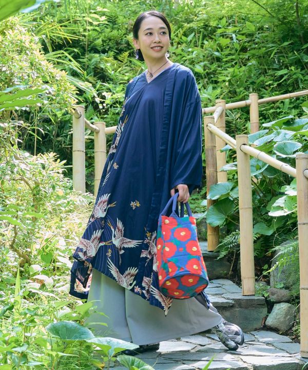 和の代表的な花をモダンにアレンジしたテキスタイルシリーズ。しっかり生地の樽型トートバッグは少々の重みではへこたれません。ペットボトルも入る便利サイズ。