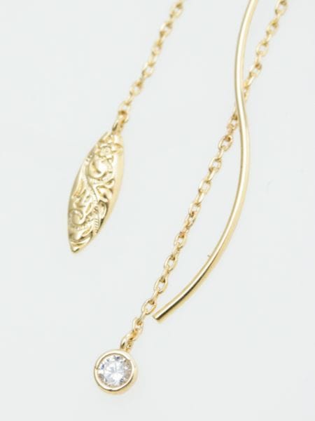 ハワイアンジュエリー調の模様が刻印された、サーフボード型のモチーフがポイントのピアス。バックキャッチ部分には立体感のあるメタルワイヤーと大きめなラインストーンが揺れる度にキラキラと輝き、女性らしいデザインになっています。台紙付き。