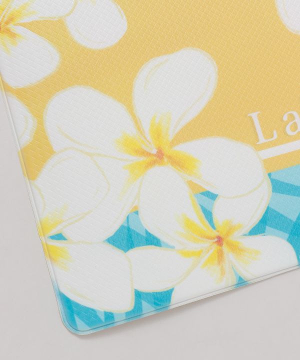 プルメリアやホヌなどハワイを代表するモチーフを描いたPVCマット。120cmサイズはキッチンやリビングのアクセントにおすすめ。防水でお手入れ簡単、ソフトな踏み心地で快適に使えます。裏面滑り止め加工付き。