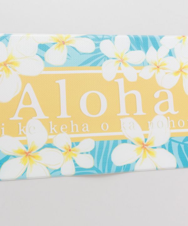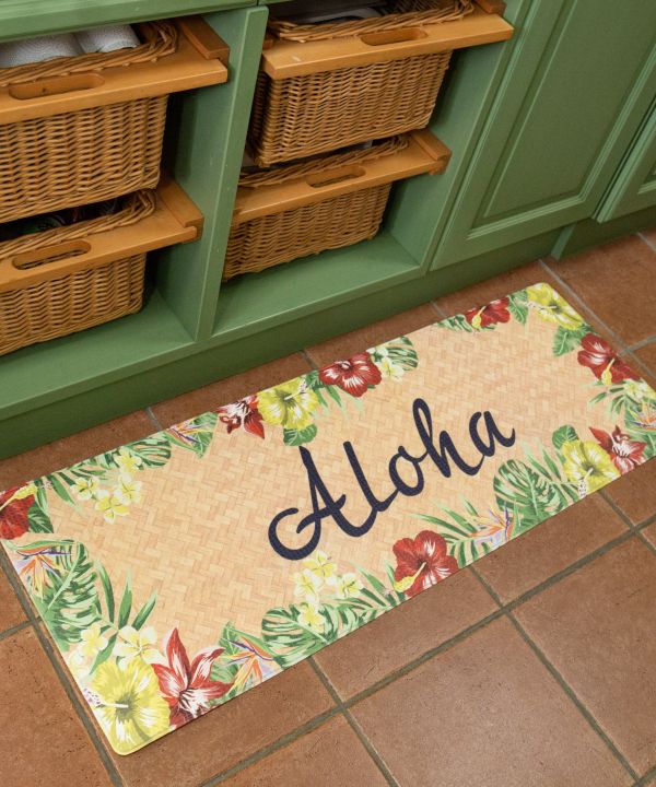 プルメリアやホヌなどハワイを代表するモチーフを描いたPVCマット。120cmサイズはキッチンやリビングのアクセントにおすすめ。防水でお手入れ簡単、ソフトな踏み心地で快適に使えます。裏面滑り止め加工付き。