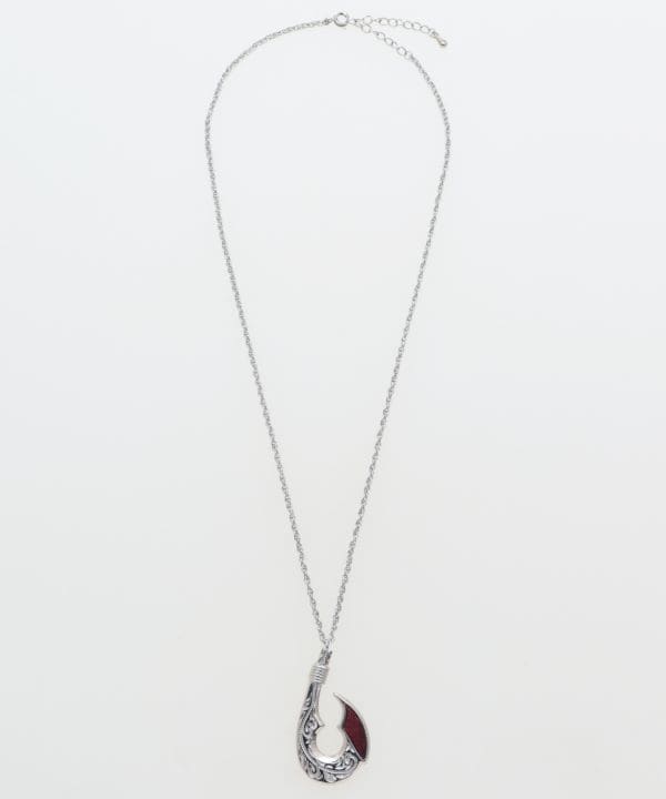 ハワイアンジュエリーのようなデザインのフィッシュフックとサーフボードのネックレス。。コアウッド調のウッドと合わせてインパクトのあるデザインに。フィッシュフックは魚を釣り上げることから、幸せを釣り上げるという意味がある。サーフボードはハワイ王朝時代にワイキ