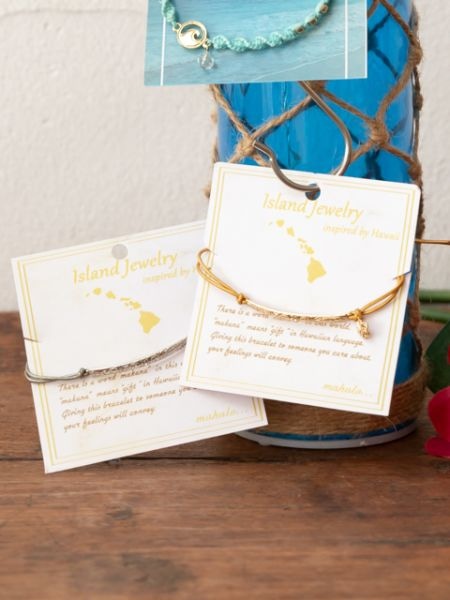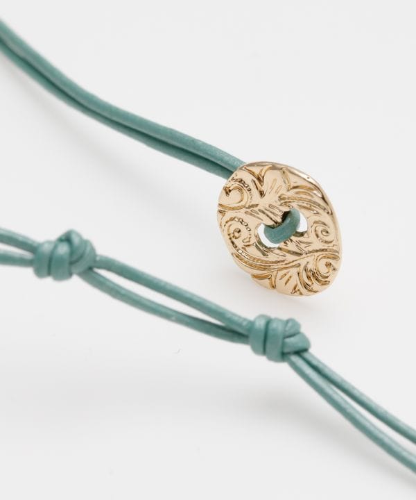 ハワイアンジュエリー調の模様を入れたプレートにカラフルなレザーコードを通した上品なブレスレット。オリジナル台紙付き。