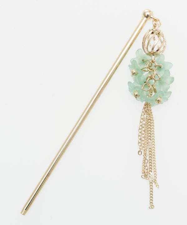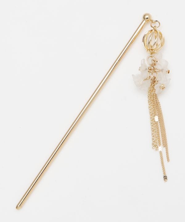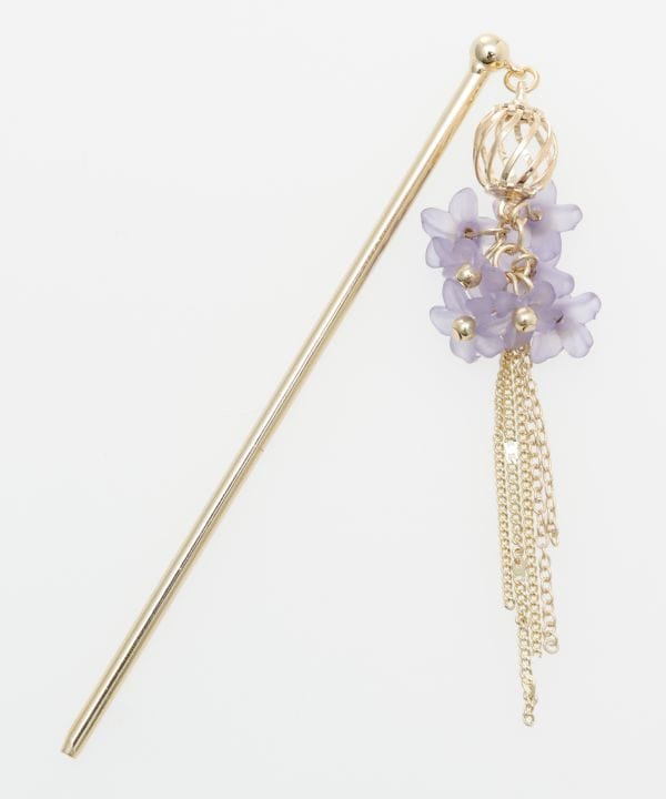 すりガラスのような柔らかな質感の小花をたくさん集めたメタル素材のかんざし。シャラリと垂れるチェーンのフリンジが女性らしいシルエットです。花モチーフは樹脂素材です。浴衣に合わせるのはもちろん、まとめ髪のアレンジに、かんざしを楽しんでみてはいかがですか?