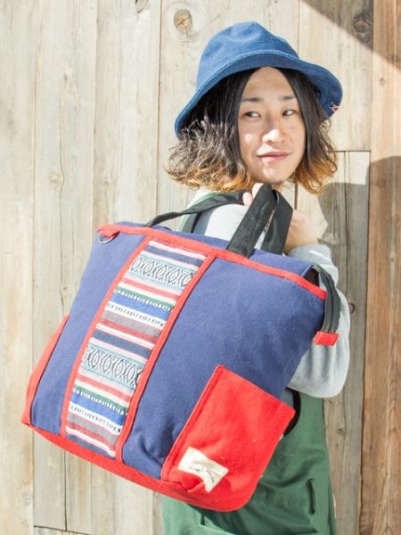 ネパール手織り生地とキャンパス地のコンビネーションが目を惹く大容量トートバッグ。バイカラーの大きなポケットがアクセントに。内ポケット付き。縁のリングにキーホルダーや小物を下げて、自分好みにアレンジしていただけます。バッグ口はファスナー仕様。