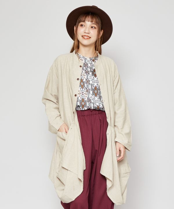 唯一無二のこのシルエットに心奪われる。たっぷりとしたドレープ感が特徴のスタンドカラーロングシャツ。ココナッツ製のボタンを全て開放してカーディガンとしても使用可能。自然界にあるアースカラーの展開で、旅先の景色の中に溶け込みます。