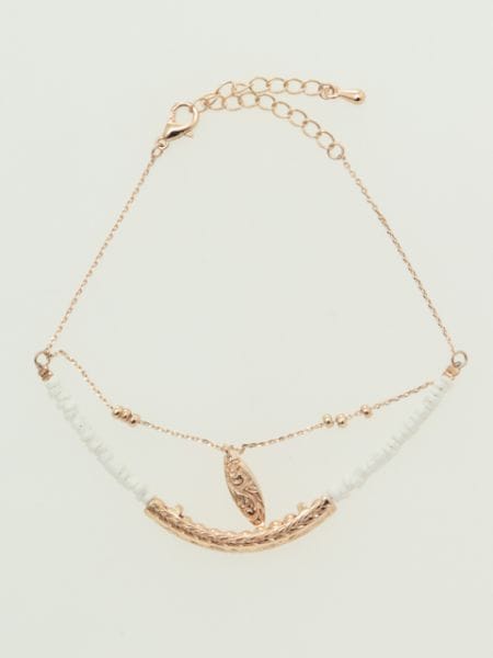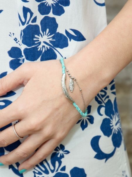 はっきりとしたカラーのビーズと繊細なチェーンを組み合わせ、ハワイアンジュエリー調のチューブチャームとサーフボードがポイントのブレスレット&アンクレット。足元を上品に飾ります。