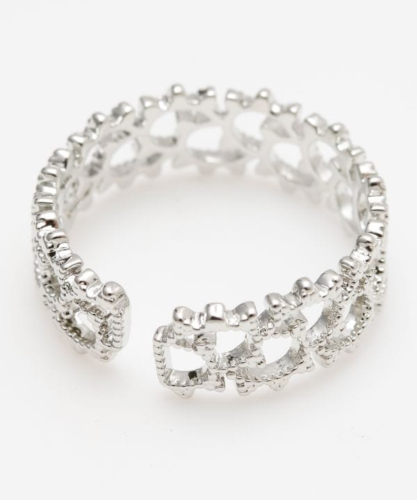 日本の伝統的な小紋柄「唐草」をモチーフにしたメタル素材のリング。唐草は生命力があり途切れることなく蔓を伸ばしていくことから「長寿」や「繁栄」など縁起のいい意味をもっています。やや幅の広いリングなのでキラキラと光る部分が多くみえ、指先を華やかに飾ります。