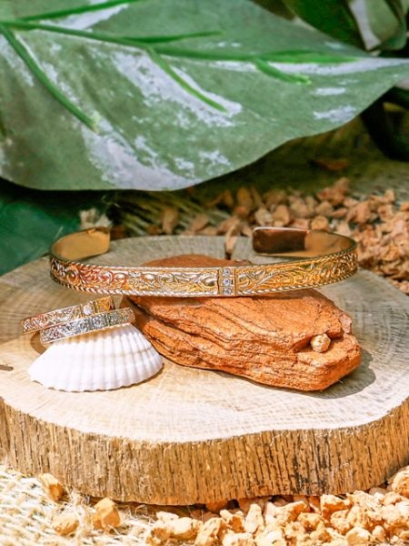 ハワイアンジュエリー調の模様が彫られたプレートバングル。流れるようなマイレの模様は「大切な人との絆」を意味し、隣に一緒に彫られている可愛らしいプルメリアには「魅力を引き出してくれる」という意味が込められているので、大切な方への贈り物にもオススメです。裏面