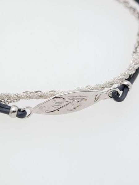 ハワイアンジュエリー調の模様が彫られたサーフボード型のブレスレット。プレートにはイニシャルが彫られており、マイレのモチーフには「大切な人との絆」を意味します。大切な方へのプレゼントとしてもいかがでしょうか。台紙付き。
