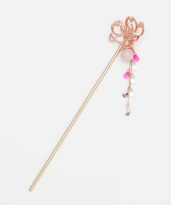 透かしの日本の花をモチーフにしたかんざし。しずくのようにクリアな色合いのビーズが落ち感もありとても女性らしいです。和の色合いのお洋服と合わせてモダンなおしゃれを楽しめます。