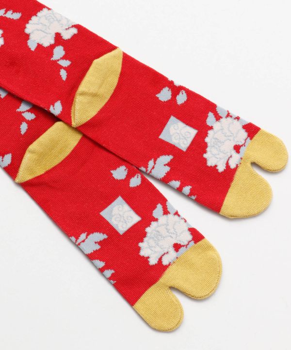 日本人の足にしっかり馴染んで履きやすい。足袋特有の履き心地。古くて新しい奈良の靴下です。牡丹の花言葉は「風格」「富貴」。牡丹の花をレトロな色合いでデザインした華やかな足袋靴下。