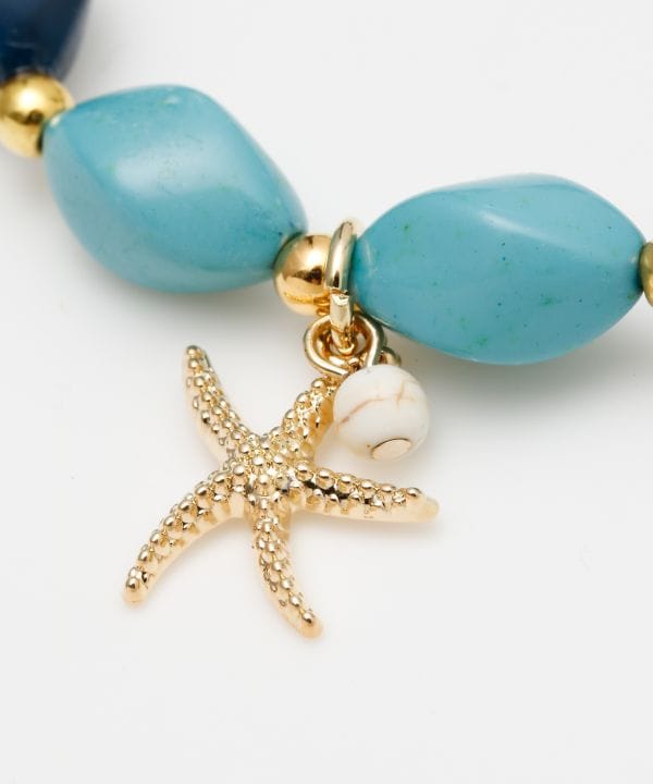 マーメイドが付けていそうなブレスレット。真ん中のスターフィッシュとターコイズが海を連想させてくれます。大切なオハナとペアでつけても可愛いですね。
