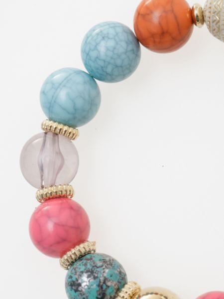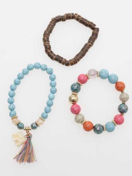 大小の天然石のようなビーズブレスセット。これだけで存在感大!フリンジや樹脂でできたエレファントモチーフもポイント◎ゴム仕様なので着脱も楽ちん♪繊細な模様をお楽しみください。