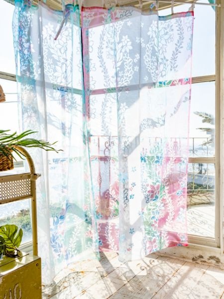 「祝福」と「美しさ」を運んでくれるという意味が込められたレイが全体に描かれたデザインのカーテン。歓迎の意味もあるレイはハワイ空間をより引き立たせてくれます。