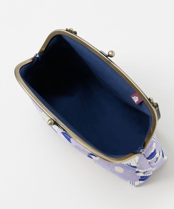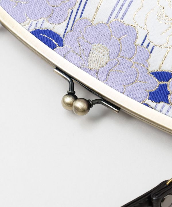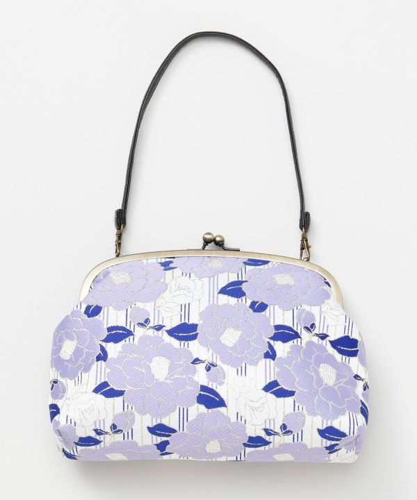 大きな椿の花を大胆にあしらった、がま口ハンドバッグ。キラキラとした金糸がアクセントになり、女性らしさをより引き立たせます。椿の花言葉は「誇り」「慎ましい優しさ」。長財布も入るサイズ感と女性らしさを感じさせる上品なデザインは和装にも洋装にも。
