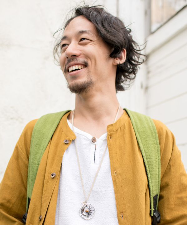 クルクル回る太陽と月。宇宙をイメージしたモチーフに、エキゾチックな天然石を組み合わせたネックレス。動きのあるモチーフは見る角度によって違った雰囲気を見せてくれます。革紐で長さの調整も可能です。