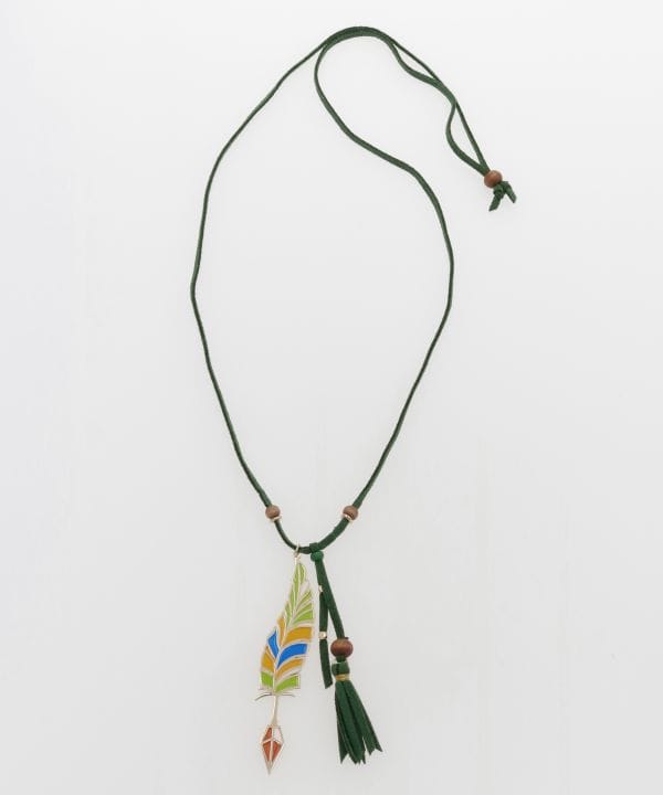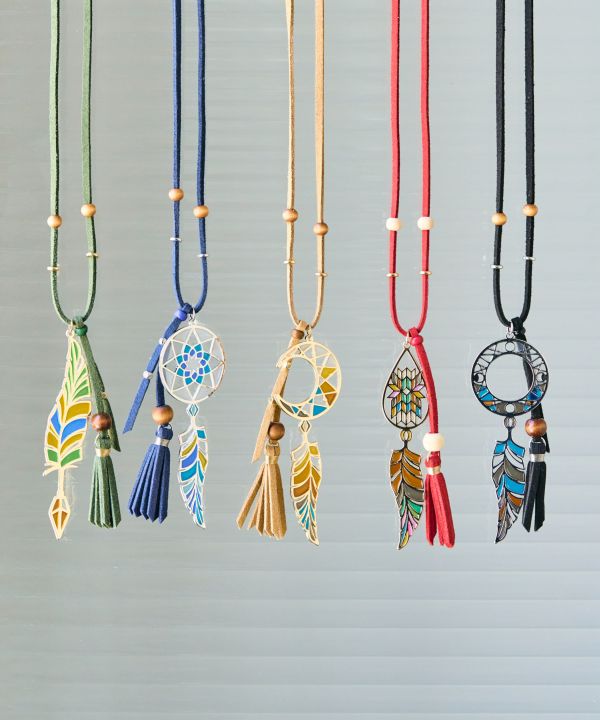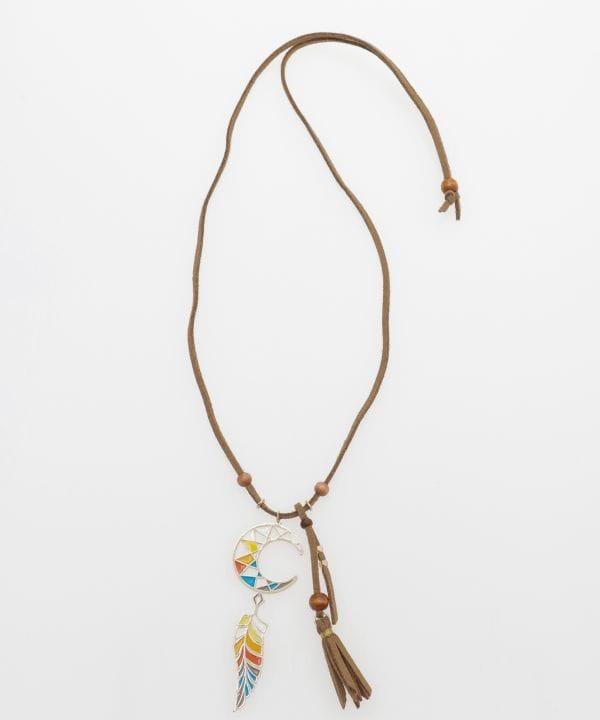 ネイティブファッションを彩る、ボヘミアン調のネックレス。小ぶりながら存在感抜群。太陽の光を色鮮やかに透かすステンドガラス調のトップが目を惹く。何気ない日常を鮮やかに彩る一本。