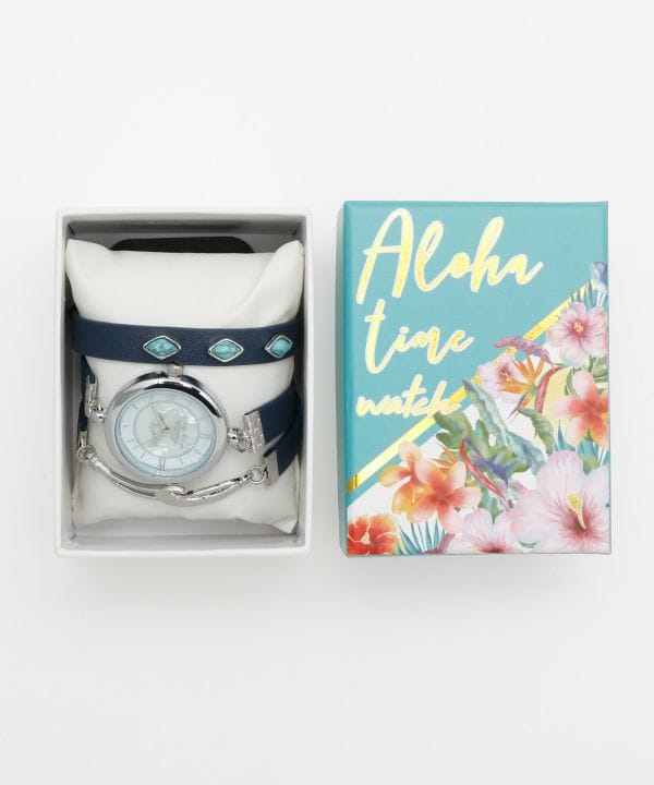 つけると連のブレスレットのようになるレザーの腕時計。ターコイズのブルーとナル(波)のモチーフが時と共にハワイの波のリズムを感じさせます。パッケージつきなのでギフトにもおすすめです。