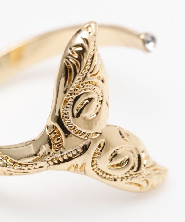 ホエールテールにハワイアンジュエリー調の彫りが施されたトゥーリング。くるりと指を囲う先でキラッと輝くクリアストーンがポイントです。ハワイでクジラに出会えることは幸運とされていることから、強運になりたい人に良いとされています。調整可能なためリングとしてもお使いいただけます。