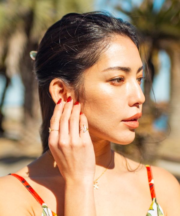 ホエールテールにハワイアンジュエリー調の刻印を施したトゥーリング。クリアストーンで波しぶきを表現し、きらりと輝くアクセントに。幸運を象徴するモチーフが指先を囲むデザインです。サイズ調整ができ、ピンキーリングとしても楽しめます。