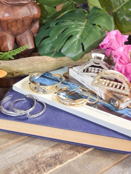 程よい太さのハワイアンジュエリー調のバングルに華奢なバングルを組み合わせた様な重ね着けテイストのデザインです。いつものバングルに足しても邪魔にならずボリュームアップ出来ますよ。