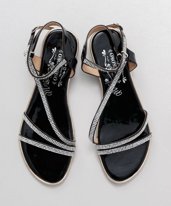 光沢のあるエナメルのヒールが、フラットで歩きやすさのあるサンダルです。ストラップ部分にあしらわれたラインストーンがきらきらと輝き、印象的な足元を演出します。