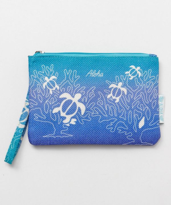 ハワイ直輸入のポーチ。パイナップル、アロハレインボーなどの、ハワイを感じるアイコンが描かれたデザイン。ぬくもりのある素材感もポイント。