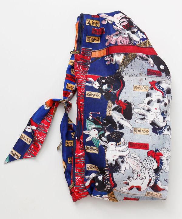 風呂敷をたすき掛けしたようなシルエットが印象的なバッグ。浮世絵を大胆にあしらい、軽やかな素材で持ち運びも快適です。両サイドにファスナー付きポケットを備え、小物の収納にも便利。街歩きや自転車でのおでかけなどアクティブなシーンにもおすすめで、男女問わず楽しめます。