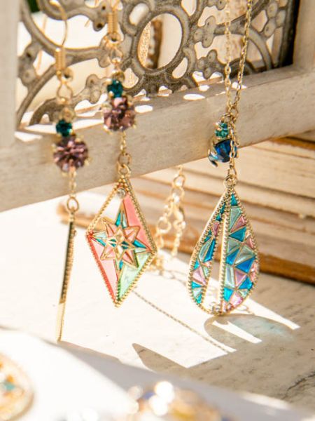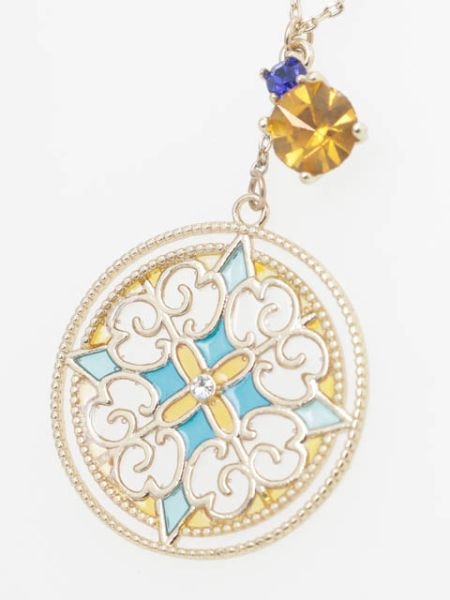 ゴージャスな雰囲気のステンドグラス風チャームの二連ネックレスです。南イタリアの澄んだ空や深い海のような爽やかな色合いと幾何学模様が、洗練された大人の印象を醸し出します。きらきらと輝くガラスビーズがワンポイント。