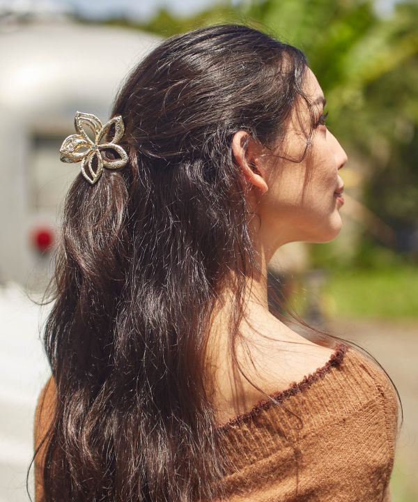 ハワイアンジュエリーのような彫りが施されたプルメリアのヘアクリップ。大きめサイズで存在感があり、キラキラと光るストーンが更に華やかさを演出してくれます。プルメリアには「自分の魅力を引き出してくれる」という意味が込められているので贈り物にオススメです。