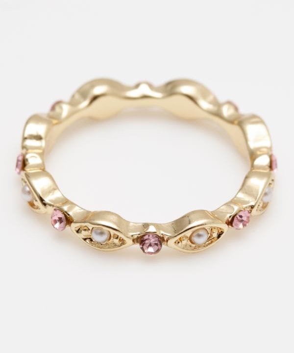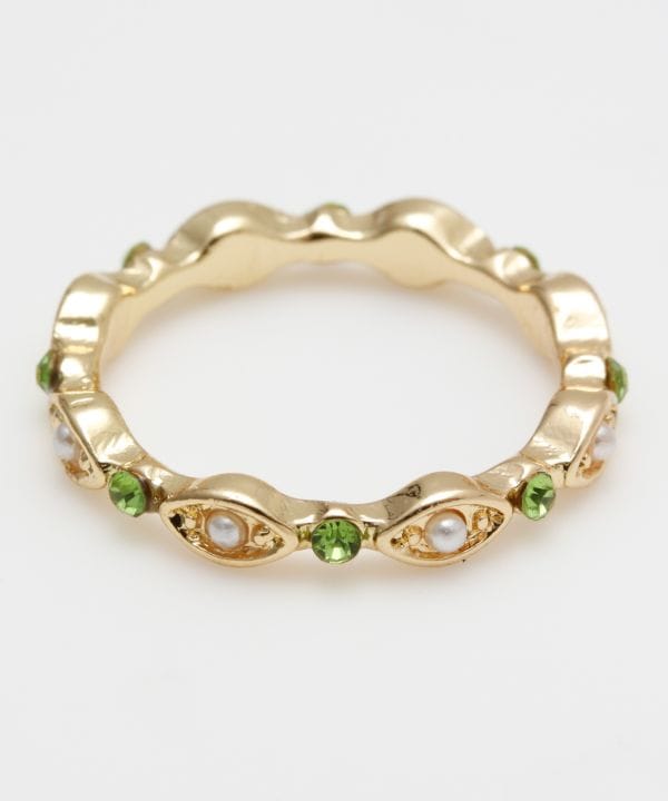 パールとガラスを使った華奢なデザインのリング。指元を華やかに彩ってくれるアイテムです。