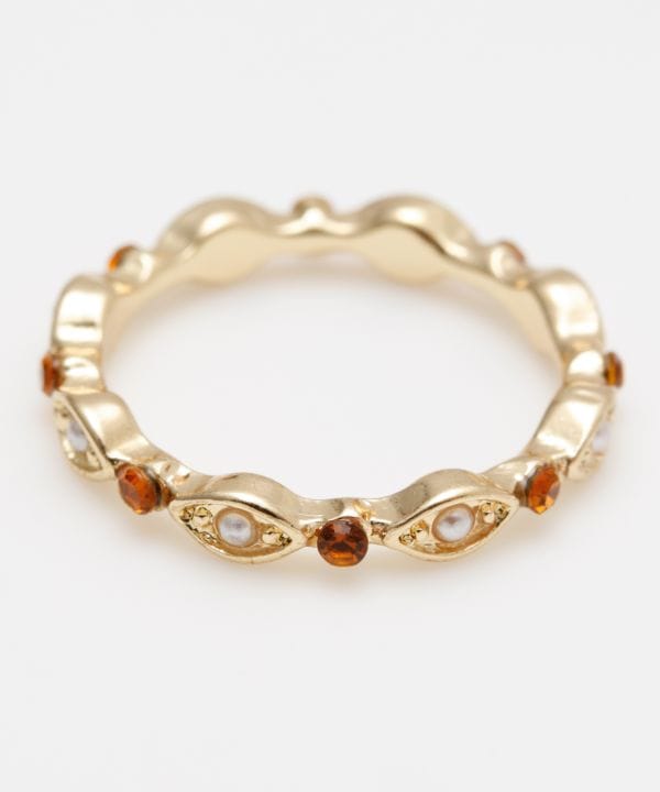 パールとガラスを使った華奢なデザインのリング。指元を華やかに彩ってくれるアイテムです。