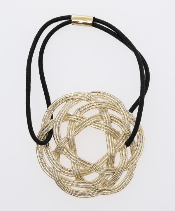 日本の祝い事に用いられる「水引」モチーフのヘアゴム。袈裟結びは僧侶の装飾として用いられる「修多羅(しゅたら)」結びの一部。六方緒じめ結びはあわじ結びを組み込んだ縁起のよい結び。あわじ結びは解けないことから「縁」を固く結ぶと云われています。細めのゴムなので、