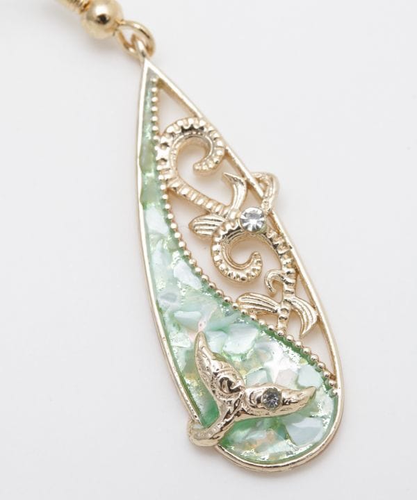 マウイ島、ラハイナの海からホエールテールをのぞかせたコホラ(クジラ)をイメージしたピアス。ハワイアンジュエリー調の刻印が施されたホエールテールと、美しいハワイの海の水面の様な色のシェルフレークを組み合わせました。ハワイでホエールテールは幸運を運び込むと言われています。