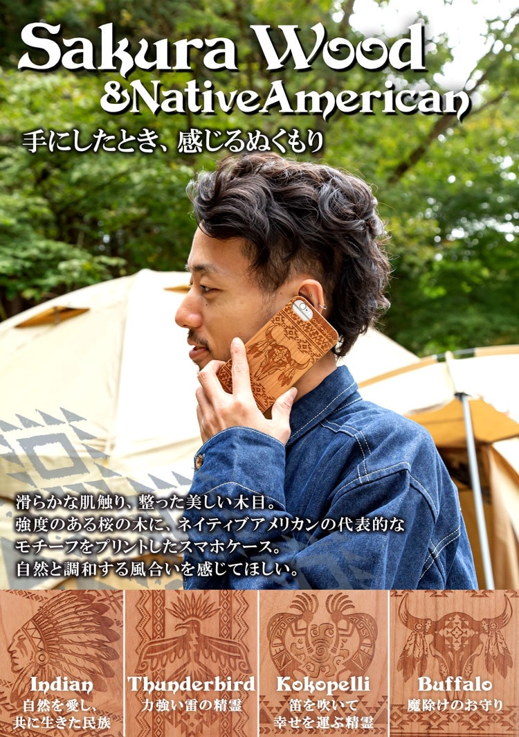 素朴な風合いの天然木とネイティブなデザインの渋いスマホケース。強度のある桜の木に彫刻されたネイティブアメリカンの代表的なモチーフがこだわりのポイント。他にはない自分らしさを楽しもう。対応機種:iPhoneSE(第2,第3世代)、iPhone8、iPhone7