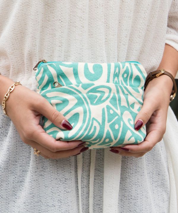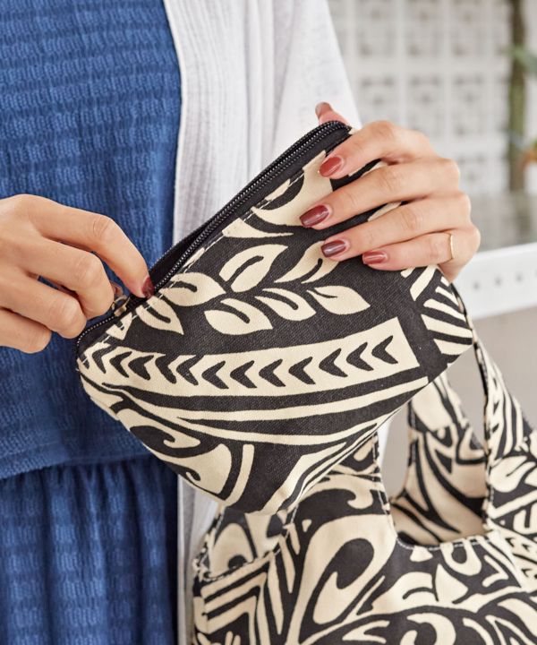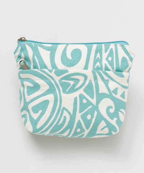 ポリネシアの伝統トライバル柄をあしらったミニポーチ。丈夫なキャンバス生地に外ポケット付きで実用的。小物収納に便利なサイズで、ナチュラルなデザインがどんなスタイルにも馴染みます。