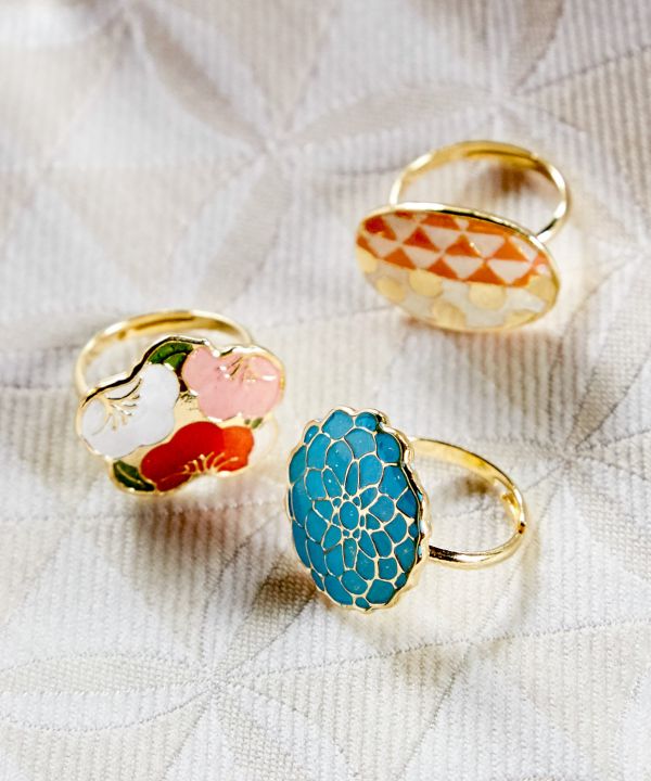 可愛らしい和のモチーフのリング。柄を手塗りで丹精込めて仕上げており、指元を華やかに彩ります。菊や梅、麻の葉など6種類の和のモチーフからお選びいただけます。