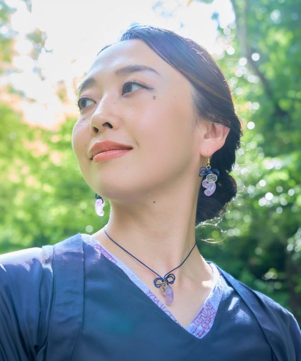 天然石の勾玉と透かし和モチーフを組み合わせたネックレス。二重叶結びをイメージしたモチーフはあなたの願いを叶えるお守りとしてどうぞ。