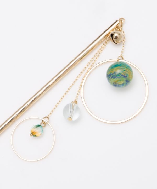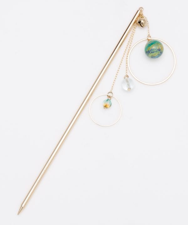 口に当てて吹くと、ぽんぴんと鳴るガラス細工をイメージしたかんざし。涼しげな丸玉とメタルのリングがで揺れて可愛らしく、お出掛けにぴったり。