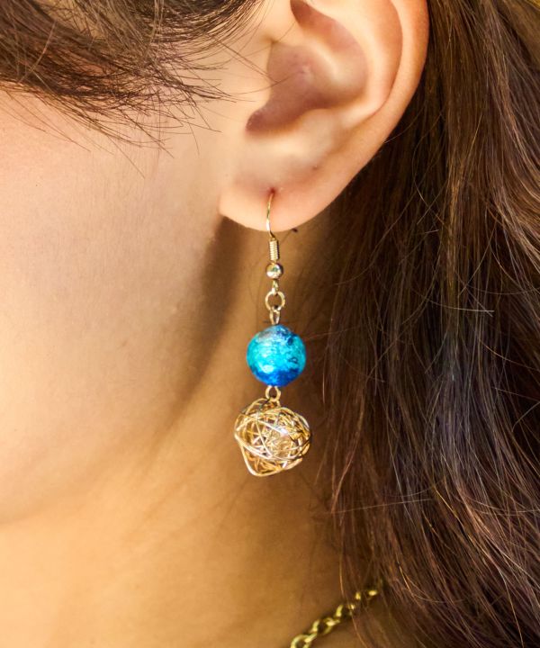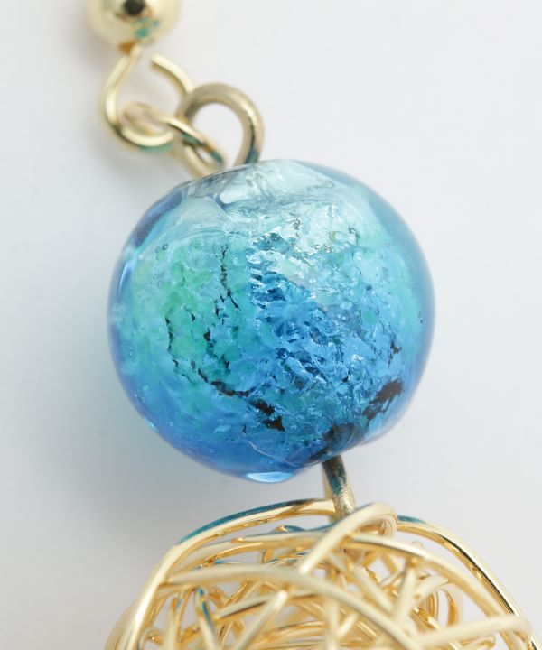 海面から光が差し込む神秘的な海の色をイメージした蓄光ホタル玉のピアス。ゴールドのワイヤーボールが軽さを演出。あなたの耳元をキラリと美しく彩ります。
