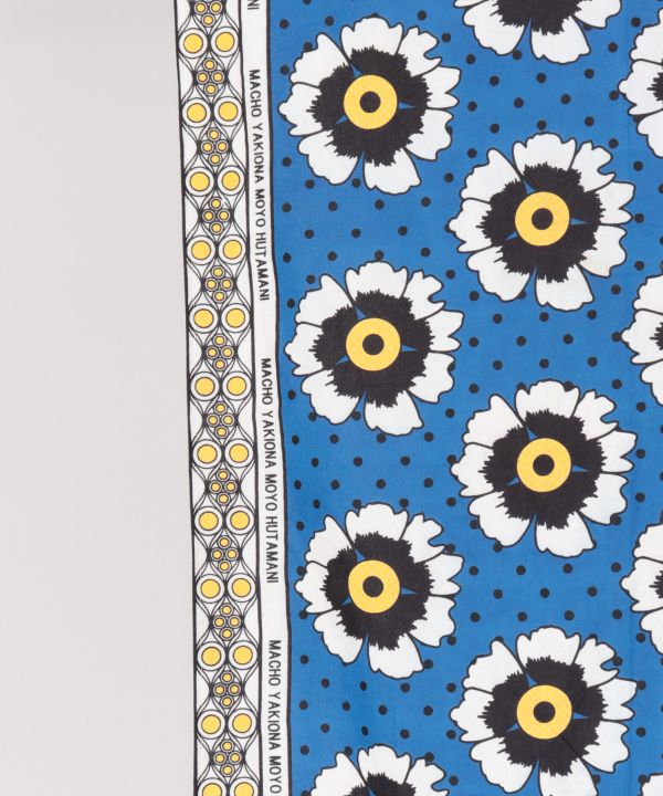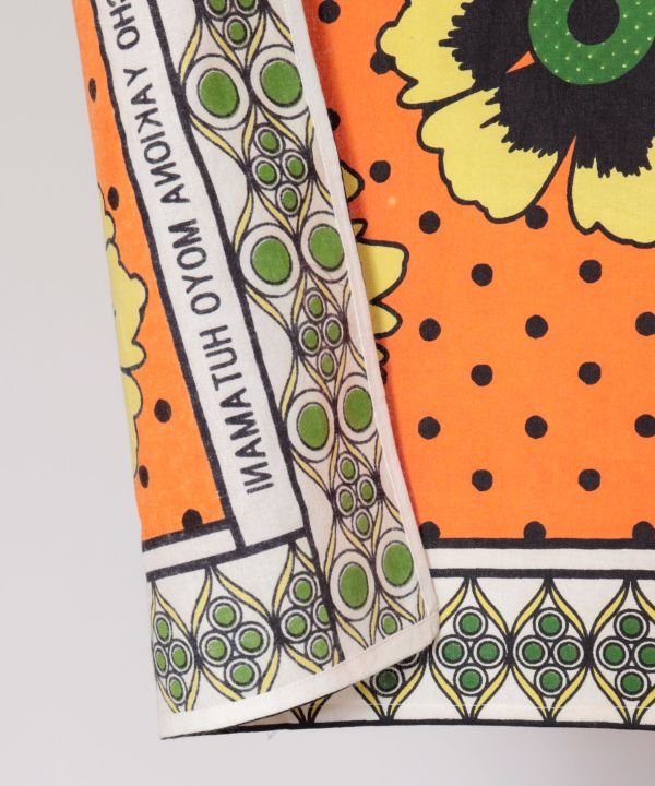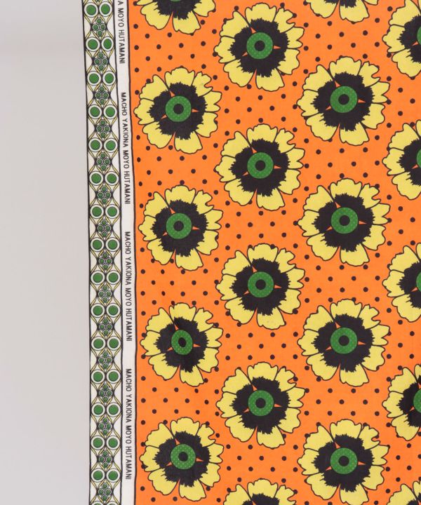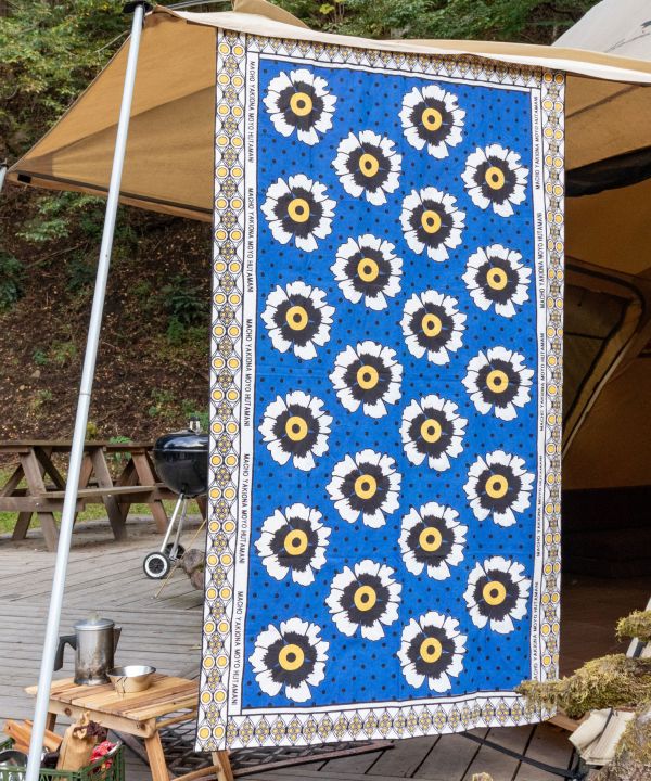 力強い色彩が魅力的なアフリカの生活布「カンガ」デザインのパーテーション。カンガに欠かせないのがことわざ。「見たら一目惚れ」と書かれており、一目惚れという花言葉を持つハルシャギクの花が描かれています。