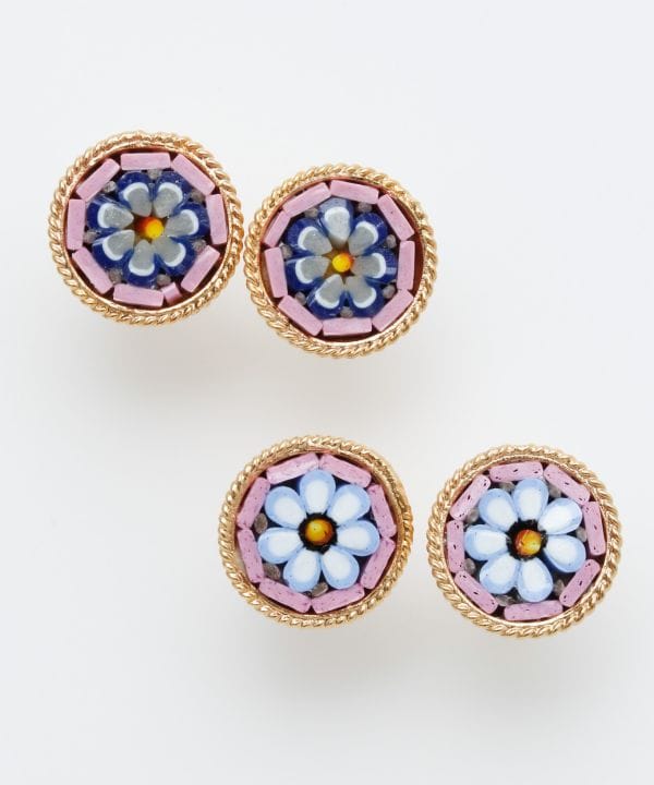 イタリア・フィレンツェの伝統技法「ガラスモザイク」で作られた、ポストタイプのミニピアス。1mmほどのベネチアンガラス(ムラーノガラス)をフレームにはめ込んで、お花などの模様を表現しています。昔ながらの職人の繊細な技が光ります。身に着けてちょっと嬉しくなるアイテムです。※ガラスモザイクは色や形が一つ一つ異なるアソートです。色や形はお選びいただけません。