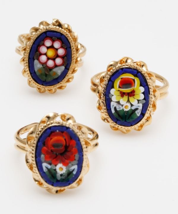 イタリア・フィレンツェの伝統技法「ガラスモザイク」で作られたリング。1mmほどのベネチアンガラス(ムラーノガラス)をフレームにはめ込んで、お花などの模様を表現しています。昔ながらの職人の繊細な技が光ります。身に着けてちょっと嬉しくなるアイテムです。※ガラスモザイクは色や形が一つ一つ異なるアソートです。色や形はお選びいただけません。