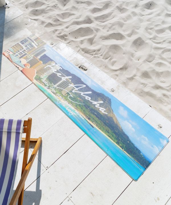 プルメリアやホヌなどハワイを代表するモチーフを描いたPVCマット。180cmサイズはキッチンカウンター前などに最適。防水仕様で汚れてもサッと拭け、おうち時間をハワイのような癒し空間に変えてくれます。裏面滑り止め加工付き。