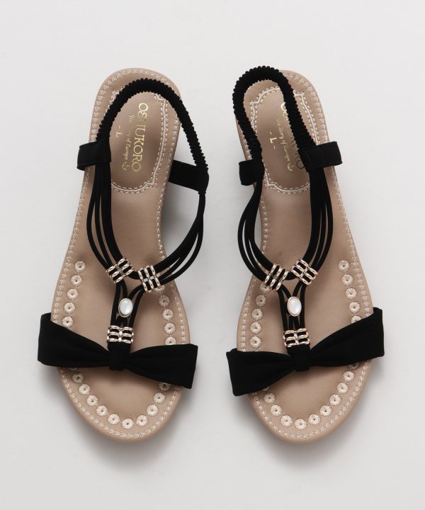 メタルパーツで美しく飾られたストラップが印象的なサンダルです。バックストラップがゴム仕様なので足にぴったりフィット。4センチのウェッジソールで、底にクッションが効いているため長時間歩いても疲れにくく、抜群の履き心地。ベーシックカラーなのでどんなスタイルにもマッチします。