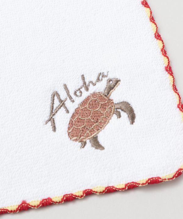 ホヌ、バス、サーフボードのワンポイントのハンドタオル。ループがついており、フックがあればどこにでも掛けられます。アラモアナセンターのショッピングからビーチへのお出かけにも幅広くお使いいただけます。
