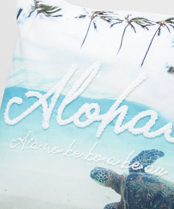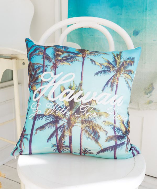ワイキキビーチを連想させるサガラ刺繍がポイントのクッションカバー。HAWAIIでパームツリーは、「家族愛」「守護」の意味があります。ホヌは、「幸せを運んでくる」「身を守る」「金運」「長寿」「海の守り神」の意味あります。ゆったりとしたHAWAIIの癒し時間を感じてみてはいかがでしょうか。※クッションの中身は別売りです。