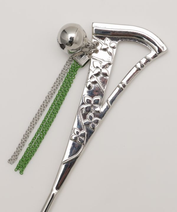 昔、芸妓が三味線を弾くときに使用したバチを、すぐに弾けるように頭に挿していた。その形をモチーフに作られたカヤオリジナルのバチカンかんざし。 紫陽花があしらわれた扇子モチーフで、揺れ動くカラーチェーンが艶やかな雰囲気に。